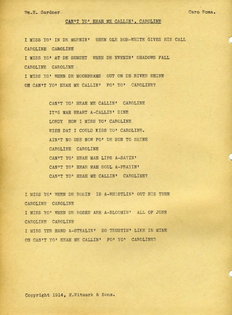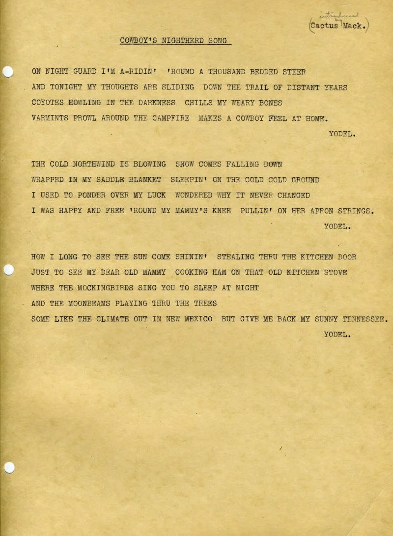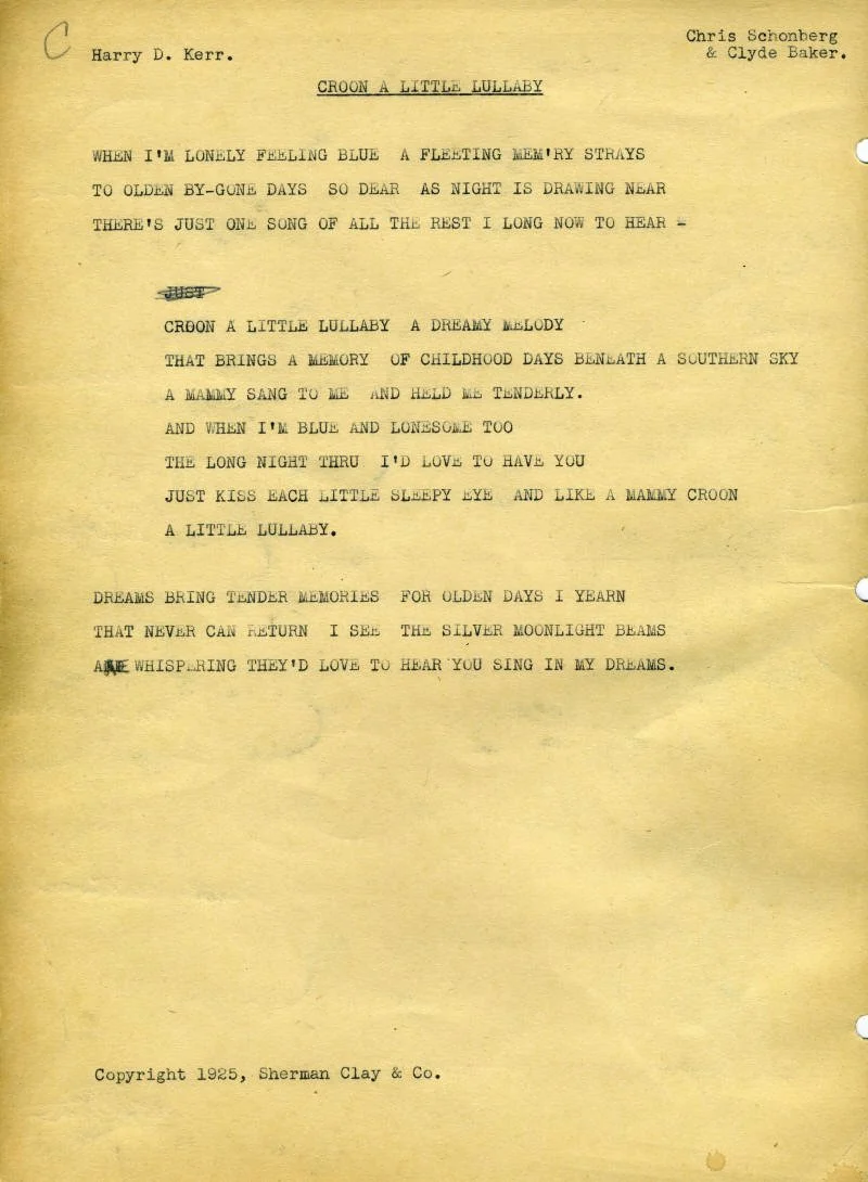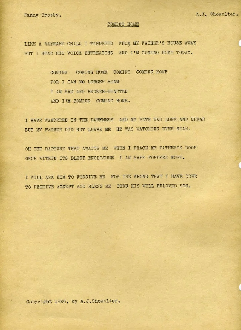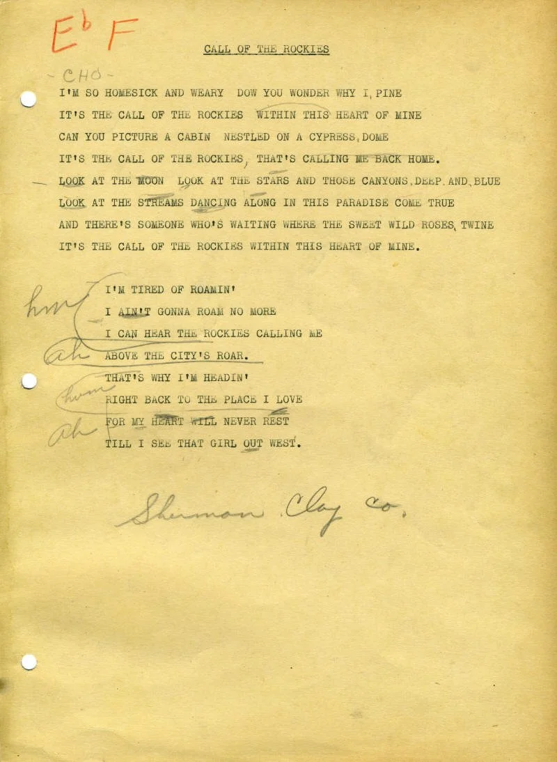 The lyric cards are filed alphabetically, just as they were found. (Eg: a title beginning with "A" or "An" might be filed under A.) The titles on the cards are not always consistent with the recording or the copyright name.