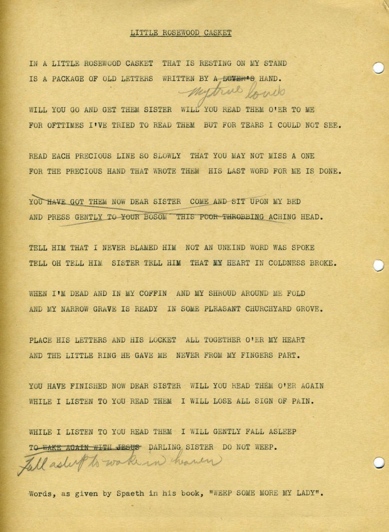 The lyric cards are filed alphabetically, just as they were found. (Eg: a title beginning with "A" or "An" might be filed under A.) The titles on the cards are not always consistent with the recording or the copyright name.