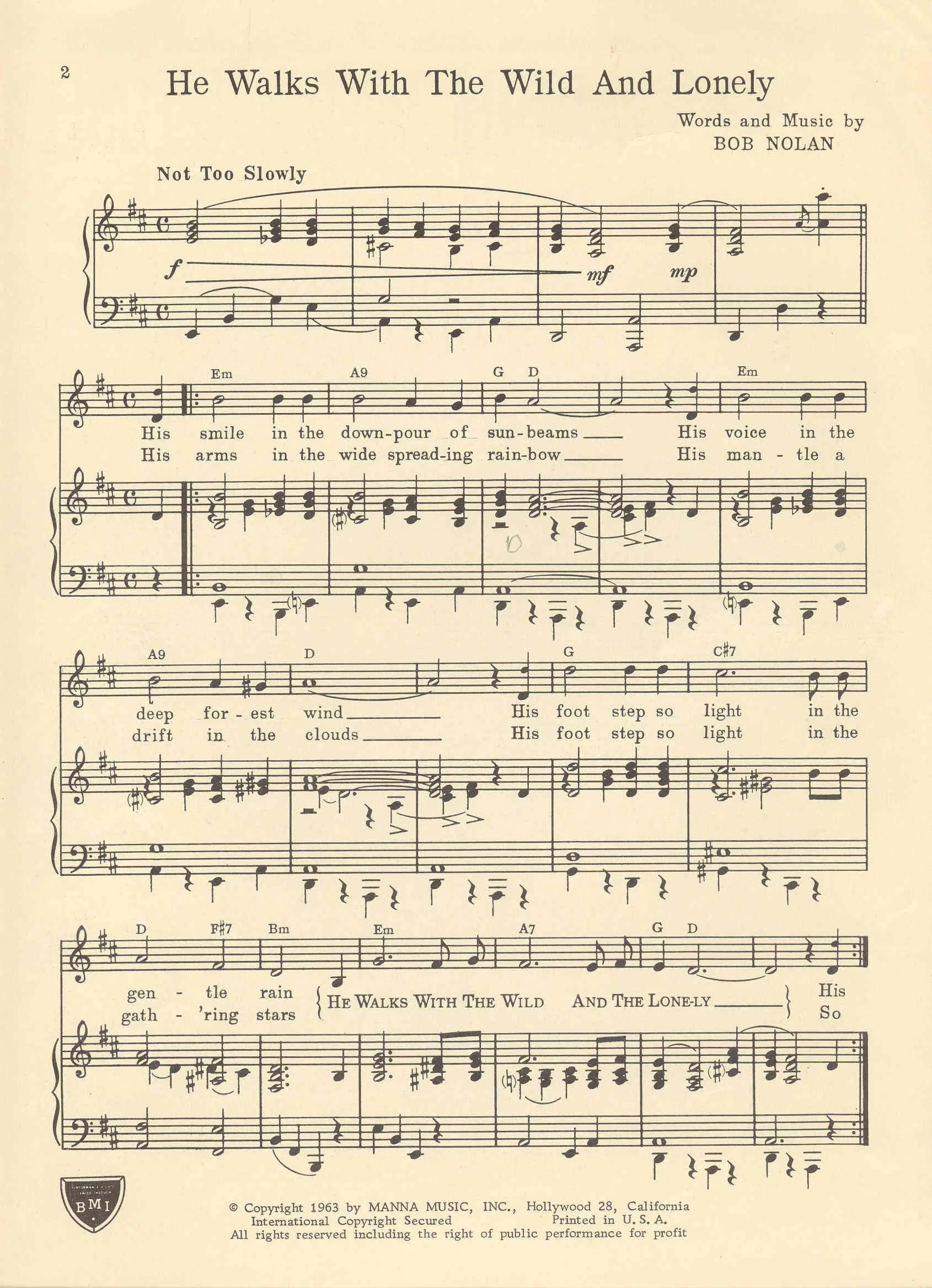 He Walks With the Wild and the LonelyBob NolanOriginal copyright: March 19, 1963Original publisher: Manna Music, Inc.