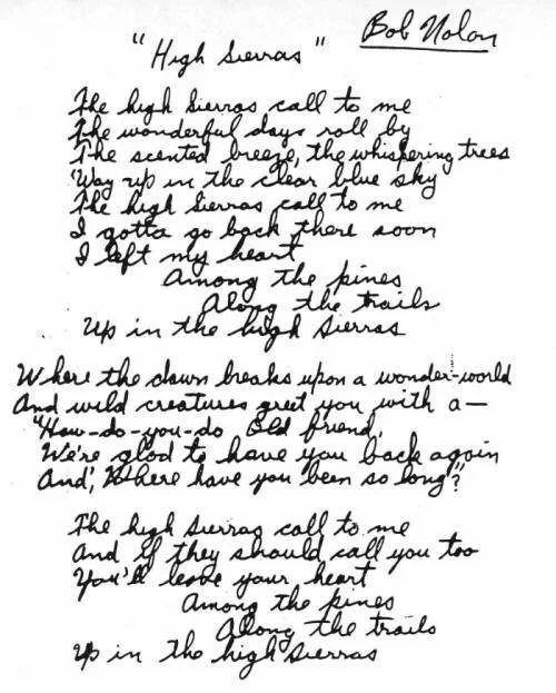 Mileusnich found a lyric sheet in Bob's hand in addition to the homemade demo recording. Bob's High Sierras demo differed only from the written lyrics in that he repeated the second and third verses.