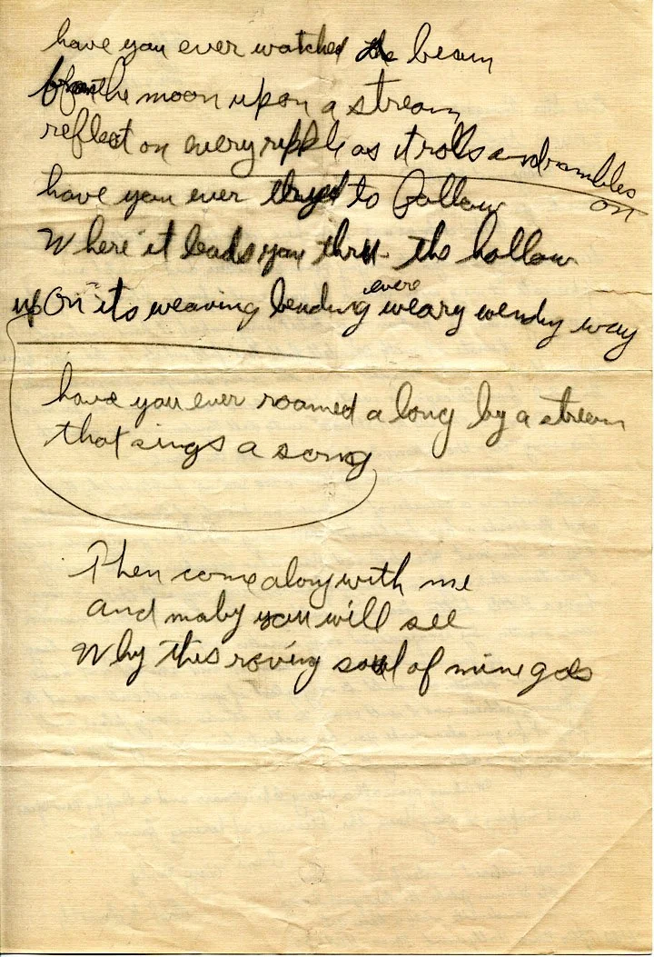 Hundreds of Bob Nolan's songs were lost in a garage fire so we are constantly on the lookout for bits and pieces he left with friends. He wrote on whatever paper was handy when the spirit moved him—and left them behind. He often had his friends copy them out for him because he was embarrassed about his poor spelling. The lyric sheets below were found in a collection of Bob Nolan compositions and ephemera of Frances Shepp Irvine Longstreet, one of his close friends who also wrote an article about him. These rough copies are in his own handwriting.Bob's original working copies