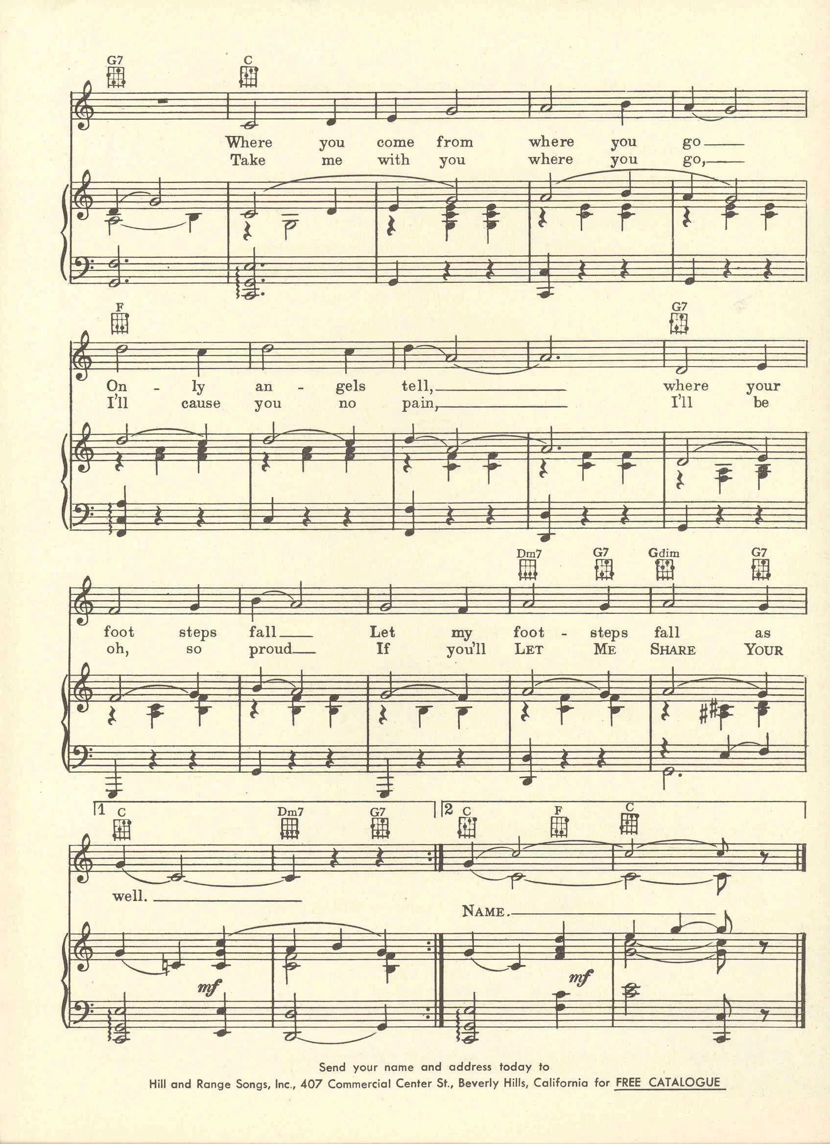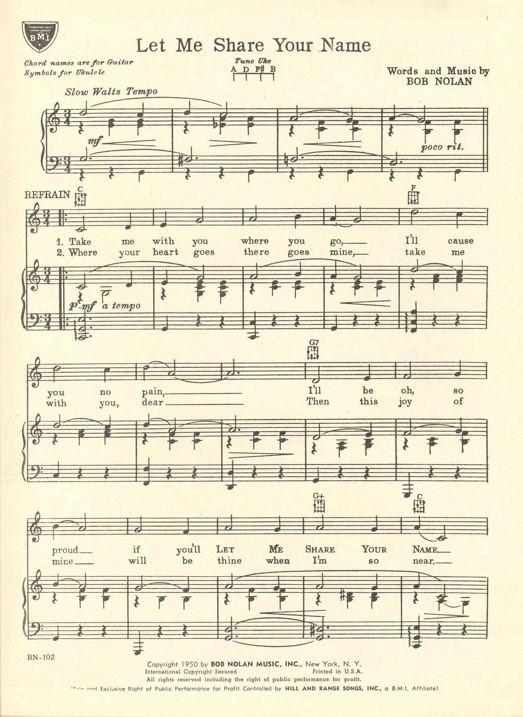 Let Me Share Your NameBob NolanOriginal copyright: April 17, 1950Original publisher: Bob Nolan Music, Inc.