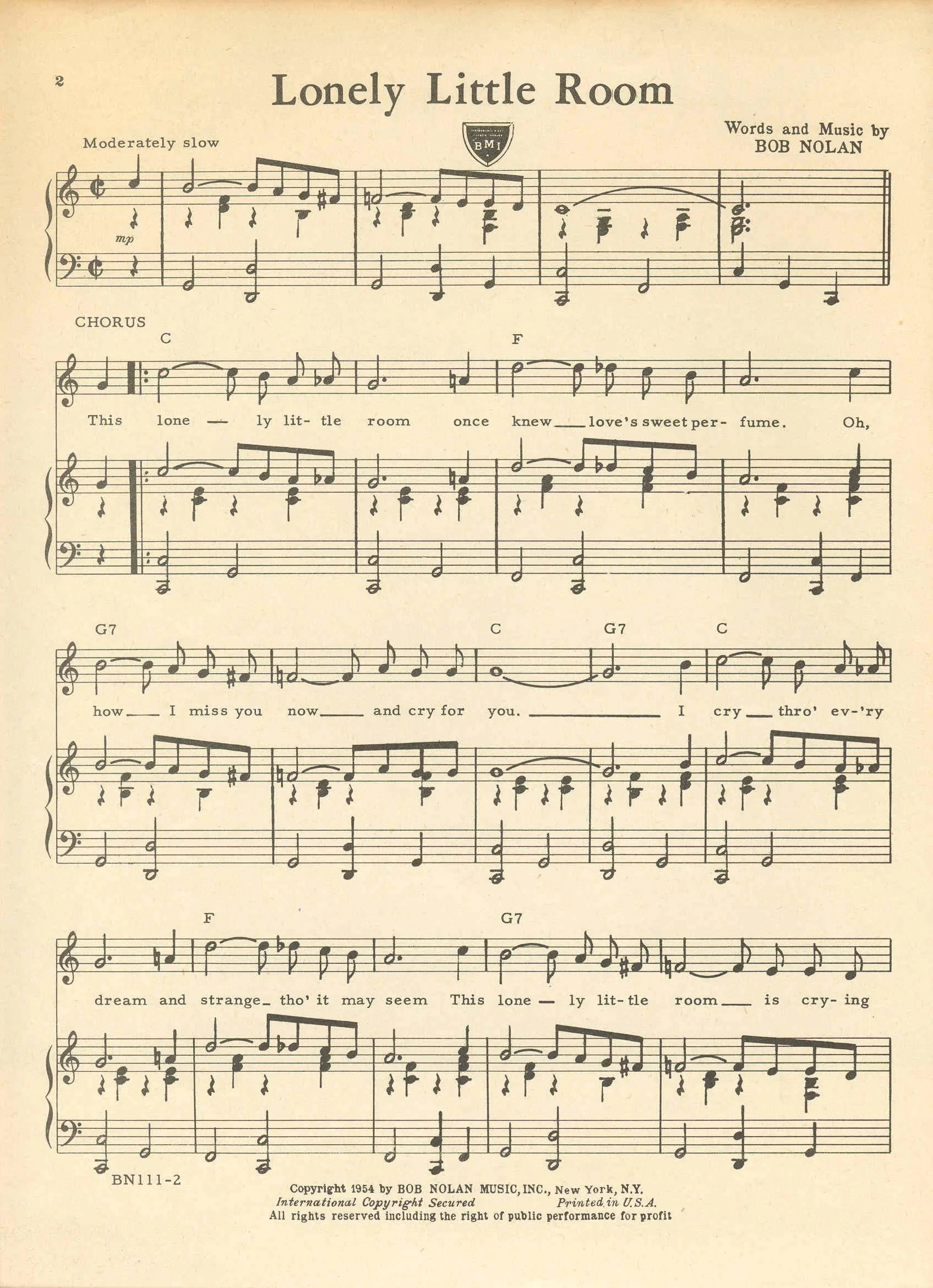 Lonely Little RoomBob NolanOriginal copyright: Lonely Little RoomOriginal publisher: Bob Nolan Music, Inc.