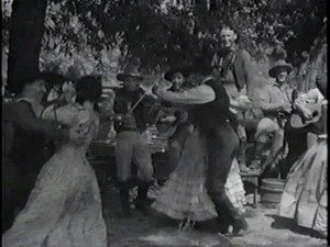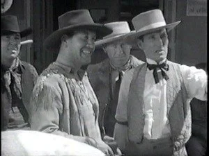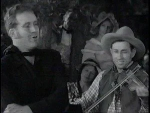 The following is the only scene involving the Sons of the Pioneers although their music can be heard accompanying the singing in other scenes. Len Slye calls a square dance and then The Singing Kid sings "Underneath a Western Sky" which identifies him to Hook's henchmen.