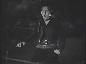 Frank writes a note to Hook warning him that he will arrive right at 8pm. He does - but Simon walks through Hook's door first and is shot. When he reports the death to the Marshall, Hook blames this on The Singing Kid, too. Frank erases Simon's chalked image from the hideout door, leaving only Hook. Hook is desperate now and thinks up a scheme to frame Frank. He hires a man (Gene Alsace) to masquerade as The Singing Kid and sing the Kid's "Vengeance" song. (Bob Nolan's voice is dubbed in here.)