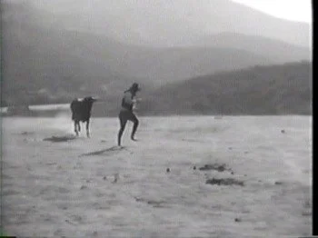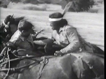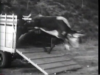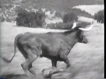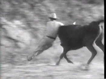 Gene rounds up the cattle but one longhorn takes off after Frog. Gene ropes the steer, takes his dallies and the steer pulls the saddle—and Gene—off into the dust.