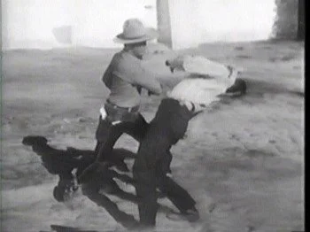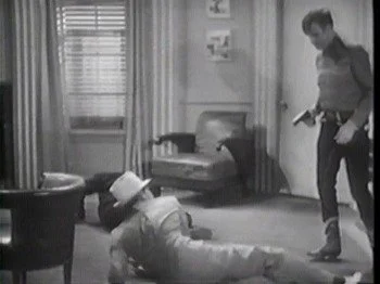 The fight is on! Gene wins, of course, retrieves the cheque and tears it up. He wants to turn the hoodlums over to the Rangers but that would mean betraying the secret. He is determined, though, to tell Marion. This leaves Wilson alone with the gangsters who sweet talk him out of the gun. Tony tells him to have $25,000 hear by 4 o'clock in the afternoon or he spills the beans about Tom Ford being Gene Autry.