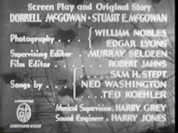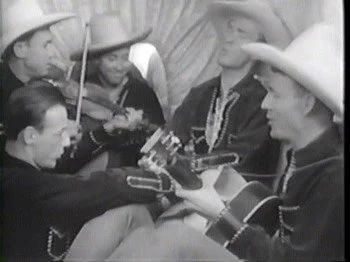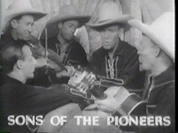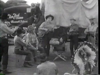 The Jones Boys' and the Light Crust Dough Boys' songs were cut when the movie was shortened for TV. The Sons of the Pioneers appear twice, in the first instance singing two songs, "The Wild and Wooly West," and then backing Gene Autry in "Nobody's Darlin' but Mine." The second time we hear (and see) them in the back of a covered wagon singing "Roll, Wagons, Roll." (If you are familiar with the film, you will notice that for some reason they are trying very hard not to laugh.)