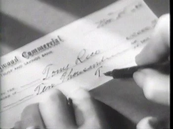 Gene tries to tell them who he really is without success. He signs a cheque for the full amount at gunpoint. As the Tony backs toward the door, he tells Gene he likes his voice and asks him when he'll sing again. Gene asks him what time it is and when Tony looks toward his watch, Gene punches him.