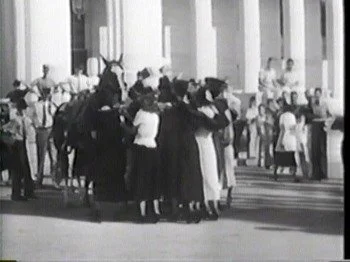 As Gene remounts to join the parade, a mob of young women surround him, pull him from his horse and steal his clothes.