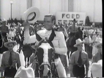 Gene, vastly uncomfortable in his role as Tom Ford's double, rides in the parade to the tune of “Ride Ranger Ride” and is welcomed by the personal representative of the Governor of Texas, who couldn't be there. He is presented with an honorary membership in the Texas Rangers and responds with a short speech. He is then introduced to the head of the Texas Rangers, Captain Leonard Pack, and his famous horse, Texas.