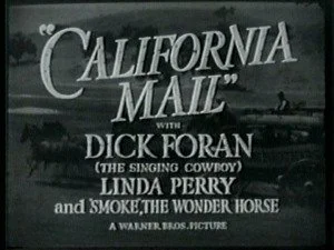 California Mail is an average vehicle for singing cowboy Dick Foran, who sings but one tune but is otherwise in fine fettle throughout. This time, hero Bill Harkins (Foran) tries to protect the local stagecoach line from outlaws who've been stealing the mail (among other things). The head of the bad guys is Roy Banton (Ed Cobb), who operates behind a cloak of respectability. But not only is Harkins more honest and able-bodied than Banton, but he's also a snappier dresser (heroine Linda Perry is no slouch in the wardrobe department either!) As was often the case in the Foran films, many of the action highlights in California Mail were lifted from First National's earlier Ken Maynard and John Ford westerns. (Unknown contributor)