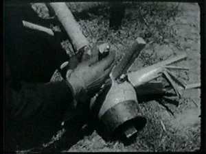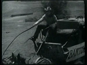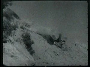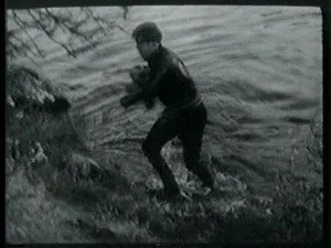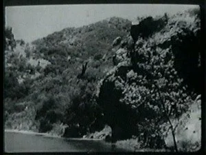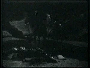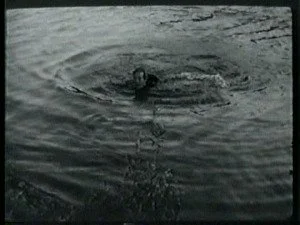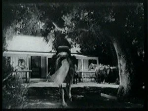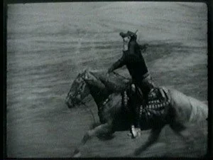 In a spectacular dive off a high cliff, Bill hits the water. The outlaws shoot at him and he sinks down. Congratulating himself that they have hit Bill, Roy leads his men home.
