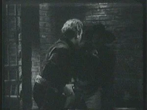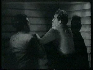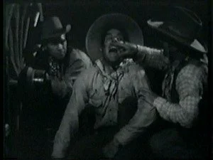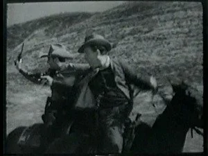 Meanwhile, Bill is chasing down the Banton Brothers and in a spectacular jump, bulldogs the two men from their horses at the same time. They still have enough energy after that horrific fall to get up and fight.