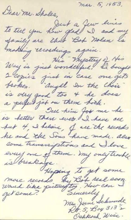 Bob’s original lyrics written on the back of the 1953 fan letter from Mrs. June Schmude