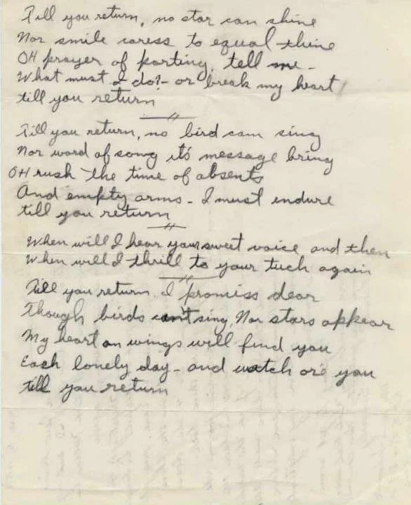One of Bob Nolan's post-Sons of the Pioneers compositions, "Till You Return" was registered for copyright as an unpublished work on April 26, 1954. Bob originally wrote the lyrics on the back of a 1953 fan letter from a Mrs. June Schmude. There was no commercial recording until Dr. Gene Davenport recorded his "Ghost Towns and Autumn Trails" CD: Pamorah Productions, 1998.