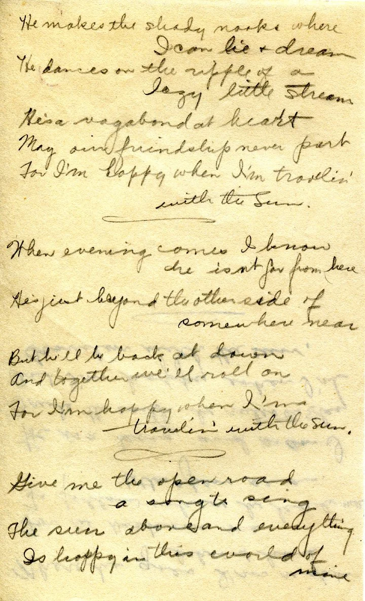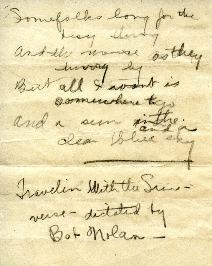 In the two renditions of then song, Nolan worked with his favorite theme – traveling, always moving on. No sweetheart was necessary for the first but she had a prominent place in the second.
