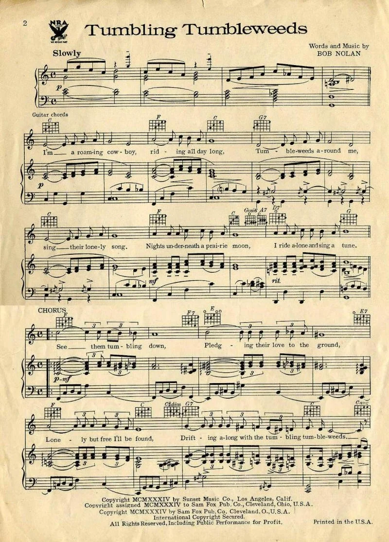 By May 25, 1934 after the Sons of the Pioneers were established, Tumbling Tumbleweeds was copyright and published by Sunset Music, a California business owned by Harry Walker. This was under the usual publisher-writer terms whereby each split the royalty 50-50—half for the publisher and half for the songwriter.