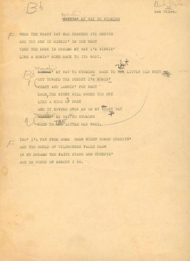 The original title on the typed song sheet was “Wingin’ My Way to Wyoming”. Bob crossed out “Wingin’” and penciled in “Wendin’” in the title and in the 1st and 7th lines of the chorus. Key of B♭ is designated. Lem Giles’ name is typed on the upper right-hand corner and Bob has added "Bob Nolan &" above it in pencil.